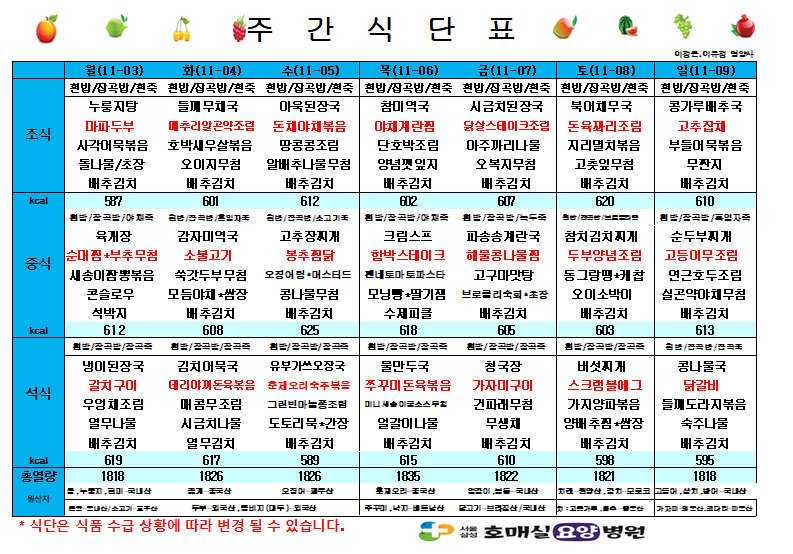 제목 11월 첫째주 식단표