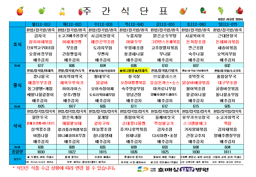 제목 12월 첫째주 식단표