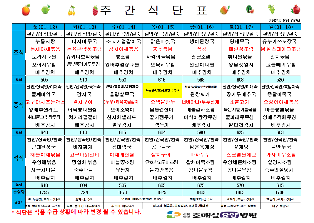 제목 1월 셋째주 식단표